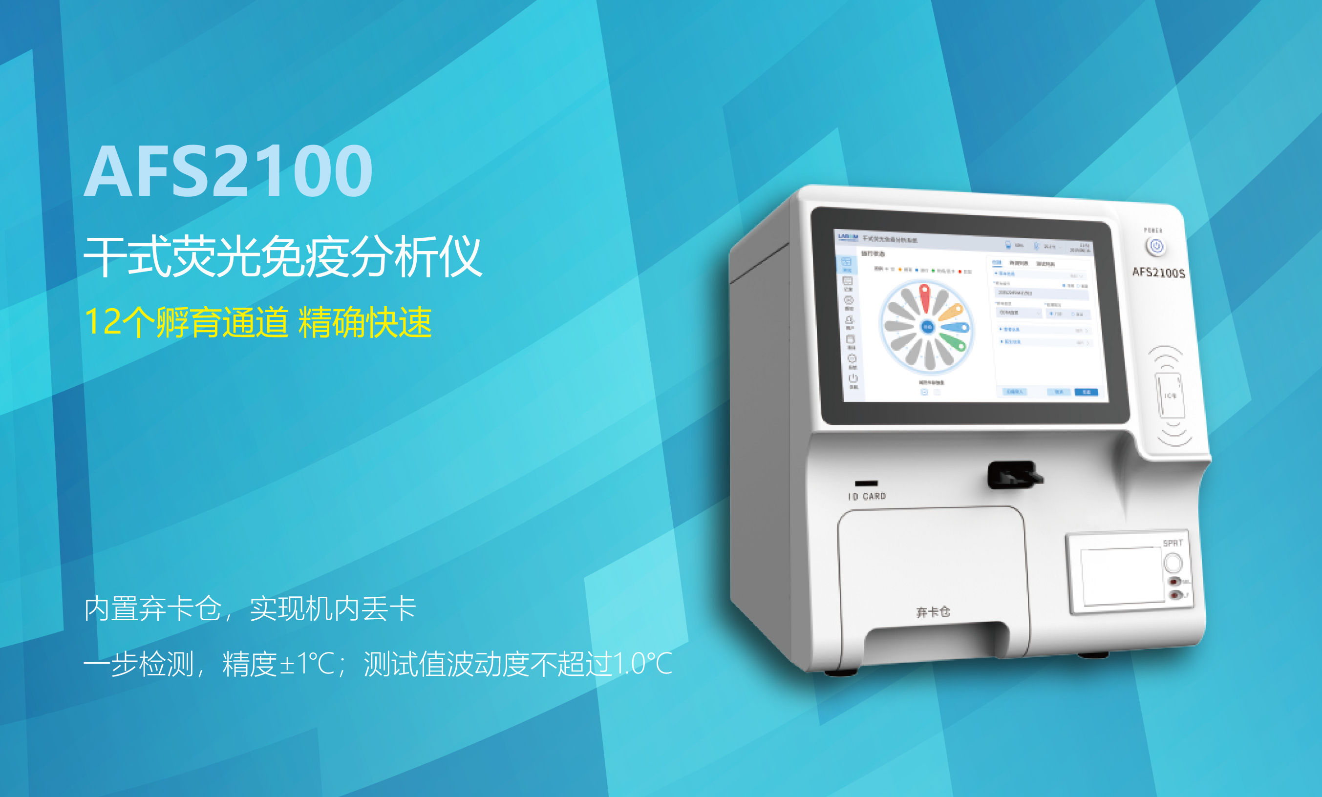 全新的UI設(shè)計(jì)界面 | 12個(gè)獨(dú)立孵育通道 | 內(nèi)置試劑卡棄卡倉(cāng) | 自動(dòng)感應(yīng)試劑卡插入、自動(dòng)丟卡 | 內(nèi)置熱敏打印機(jī)自動(dòng)打印檢測(cè)結(jié)果